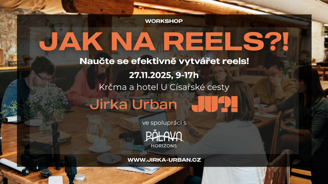 ✔ Celodenní praktický workshop Jak na reels?! pod vedením Jirky Urbana (27. listopadu 2025, 9:00–17:00) v Krčmě U Císařské cesty v Branišovicích.